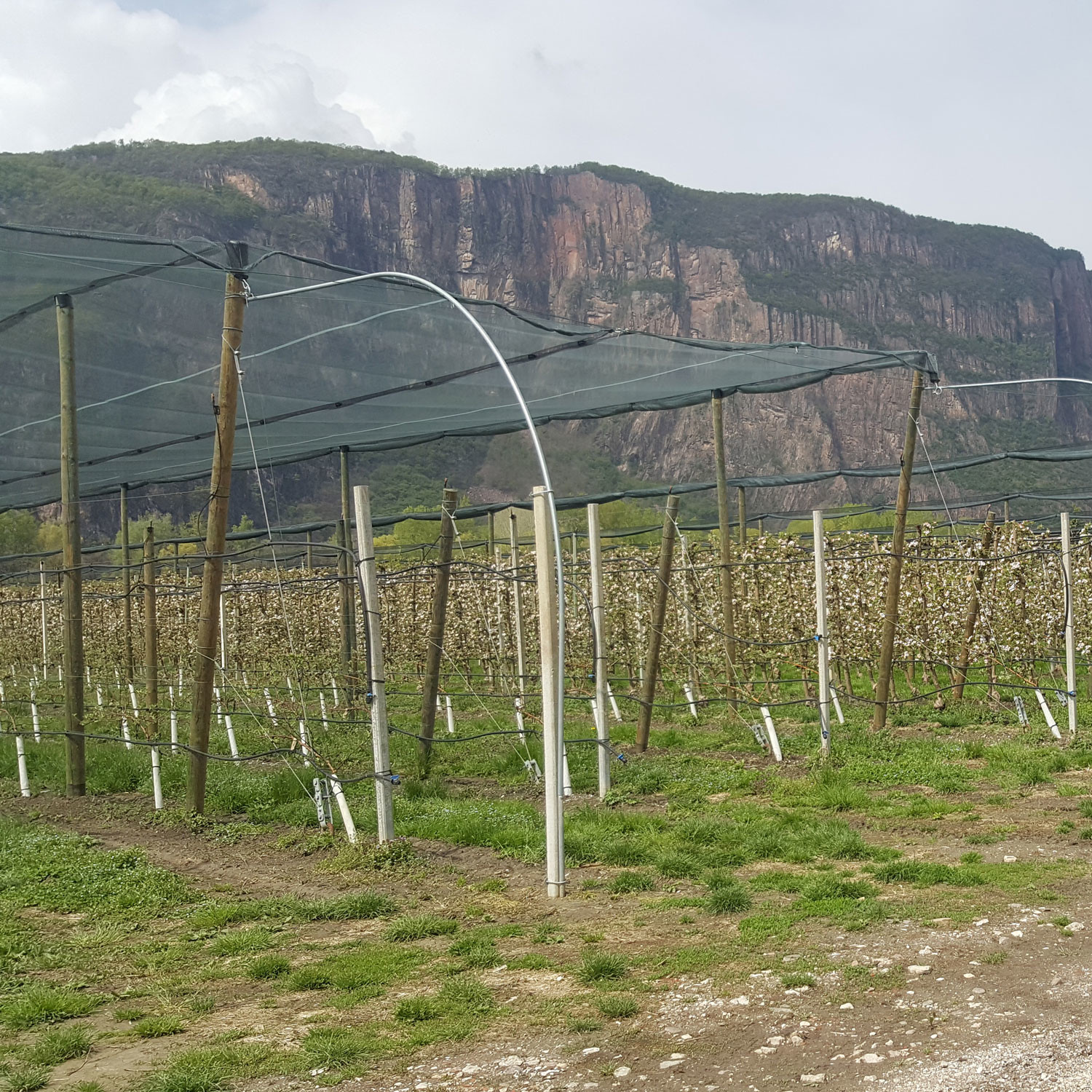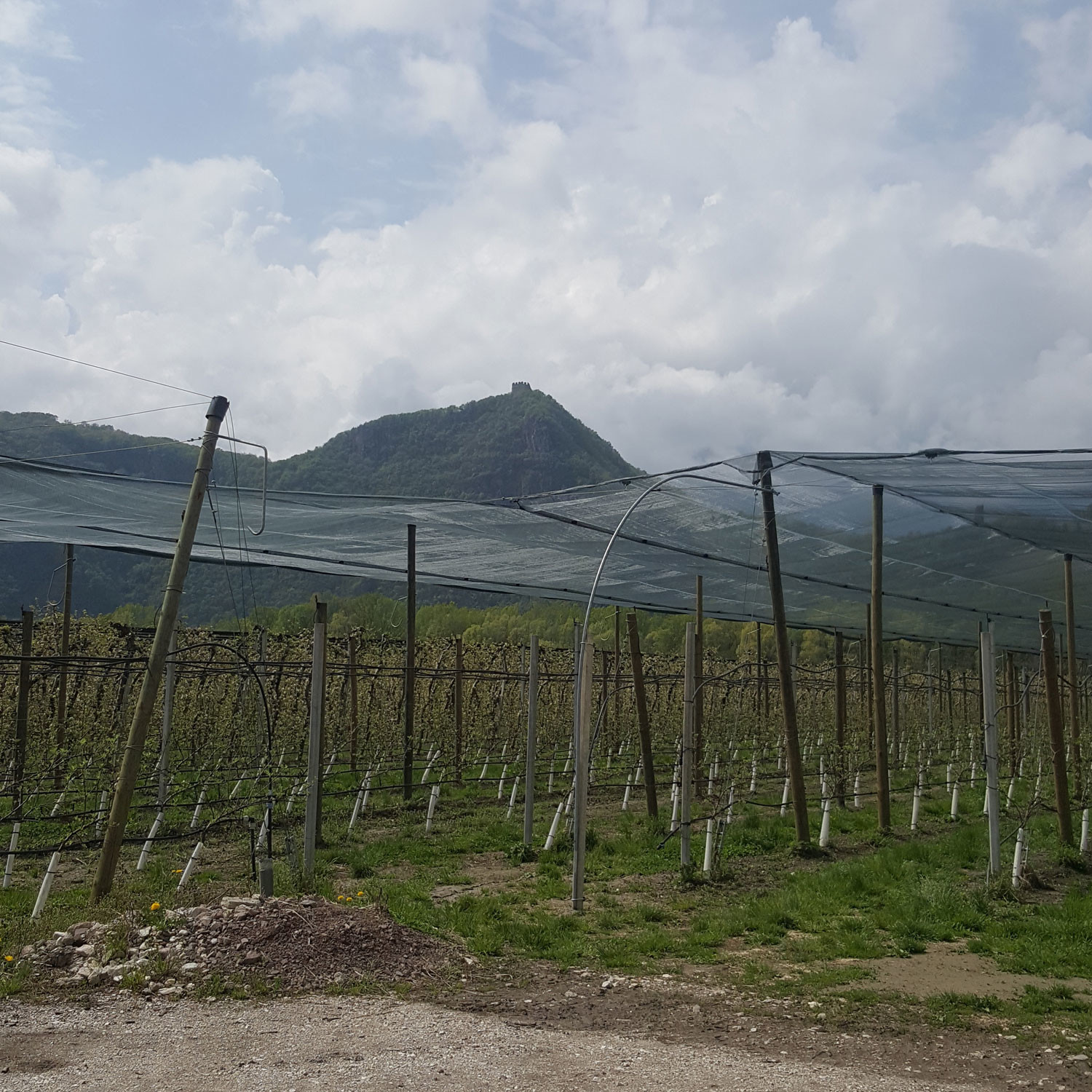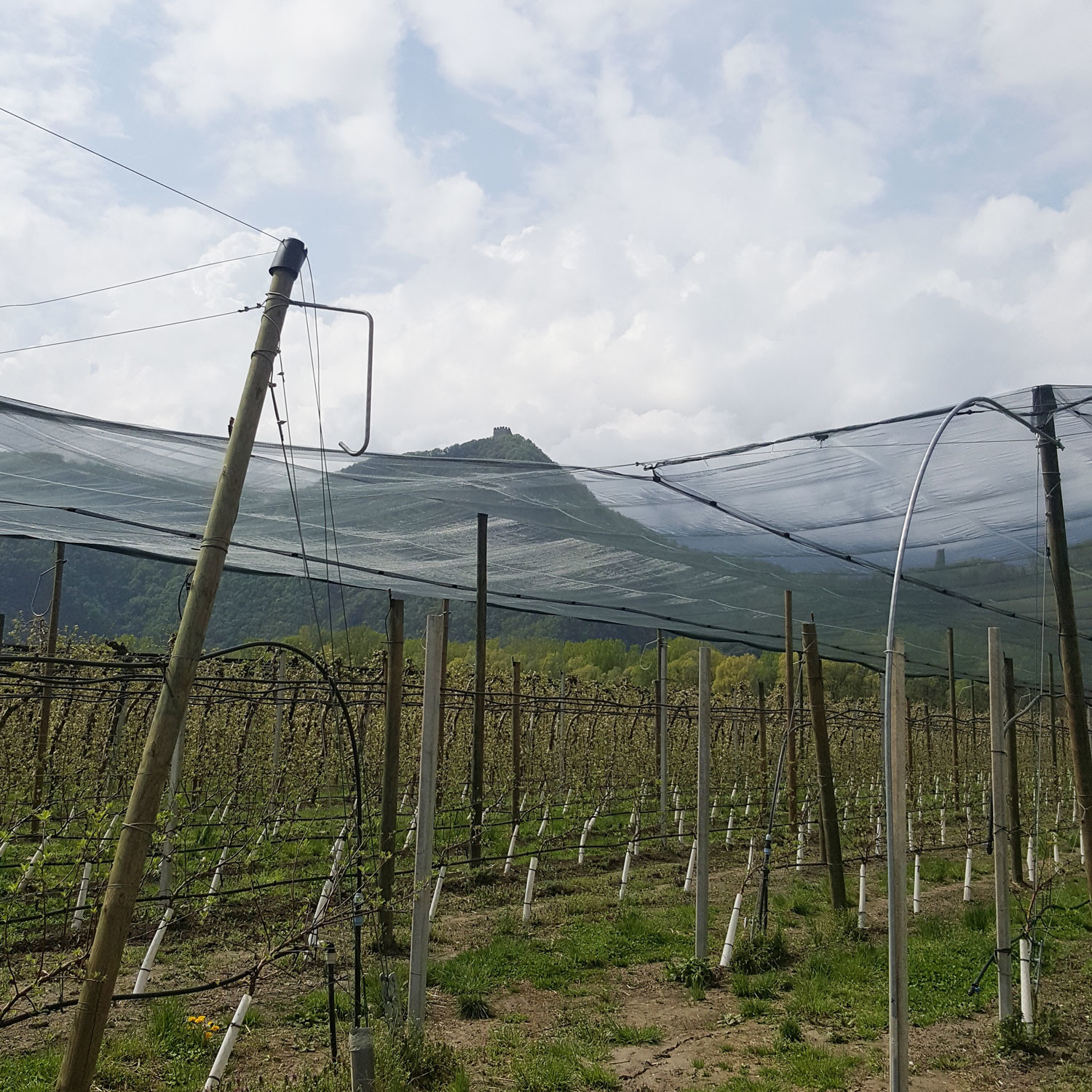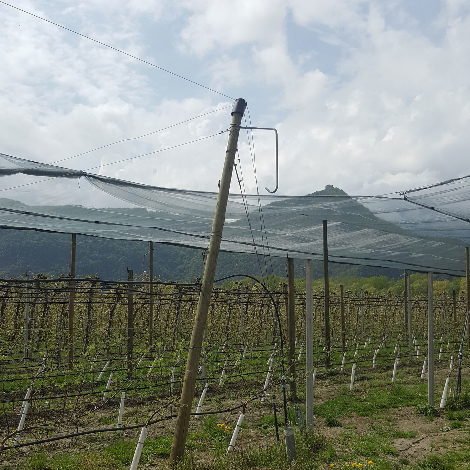 Sotto il vigile occhio della rocca di Laimburg uno splendido impianto antigrandine realizzato interamente con pali in legno Stebopal, senza alcun ancoraggio laterale ,e con un sistema innovativo che permette di montare reti da 8 metri.